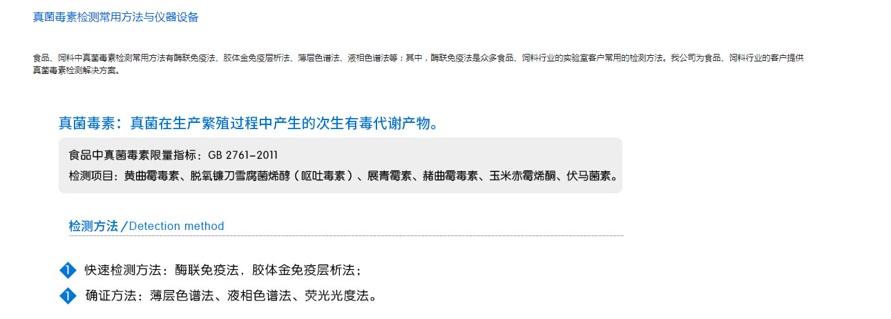 真菌毒素檢測常用方法與儀器設備 食品、飼料中真菌毒素檢測常用方法有酶聯(lián)免疫法、膠體金免疫層析法、薄層色譜法、液相色譜法等;其中,酶聯(lián)免疫法是眾多食品、飼料行業(yè)的實驗室客戶常用的檢測方法。我公司為食品、飼料行業(yè)的客戶提供真菌毒素檢測解決方案。