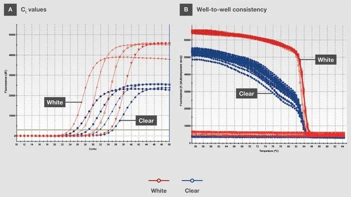 白色耗材通過阻止熒光折射出管(圖2A)來提高qPCR數(shù)據(jù)的靈敏度和一致性。折射被最小化時(shí),更多的信號(hào)被反射回檢測器,從而增加信噪比(圖2B)。此外,白色管壁可阻止熒光信號(hào)傳遞至PCR儀模塊,避免被吸收或不一致地反射熒光信號(hào),從而使重復(fù)實(shí)驗(yàn)(圖1B)中的差異降至最低。在極少數(shù)情況下,如果熒光探測器由于白色孔的信號(hào)反射增強(qiáng)而過飽和,可以使用磨砂孔替代。