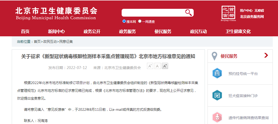日前,據(jù)北京市市場監(jiān)督管理局網(wǎng)站消息,北京市衛(wèi)生健康委員會組織制定的《新型冠狀病毒核酸檢測樣本采集點(diǎn)管理規(guī)范》,說明了新型冠狀病毒核酸檢測樣本采集點(diǎn)的基本要求、采集點(diǎn)設(shè)置、設(shè)施設(shè)備及物品、人員要求、樣本采集、樣本保存及運(yùn)輸、醫(yī)療廢棄物處理、環(huán)境消殺等多方面做出要求,指導(dǎo)北京的核酸采樣管理。