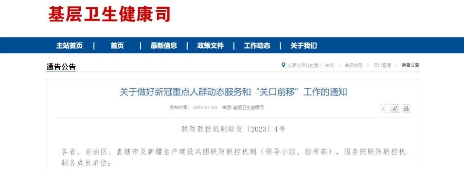 1月3日,國務院聯防聯控機制綜合組發布《關于做好新冠重點人群動態服務和“關口前移”工作的通知》