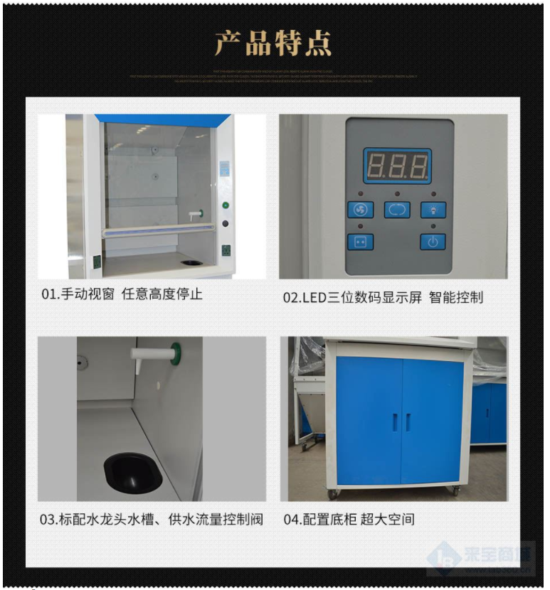* 8、通風柜配置底柜,底柜采用1.0mm冷軋鋼板經防銹處理,靜電噴涂,具有較好的光潔度與耐腐蝕性;底柜1660*480*635mm(L×D×H)的超大空間可以放置實驗室用品;底柜與上柜體配套使通風柜更加美觀實用。